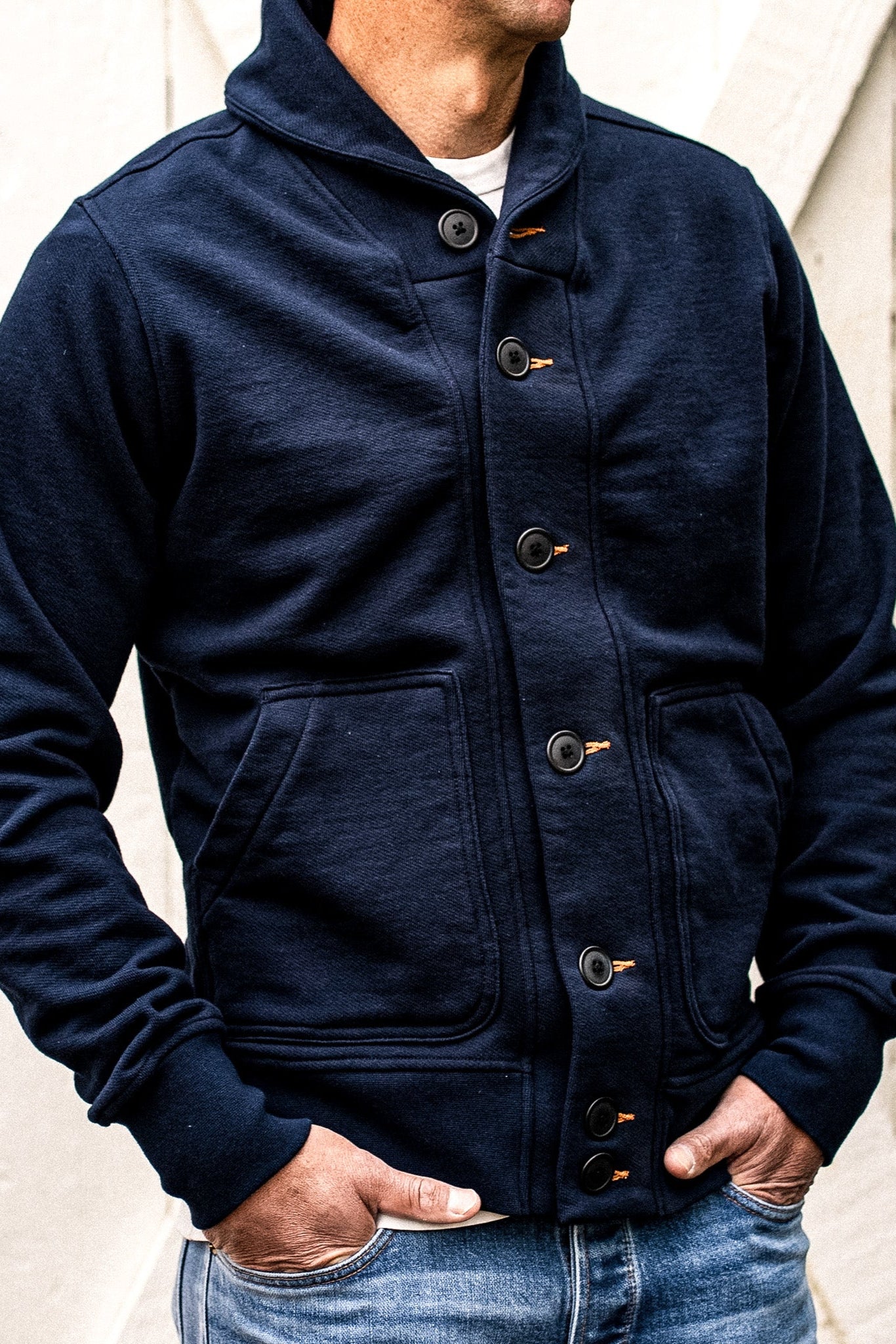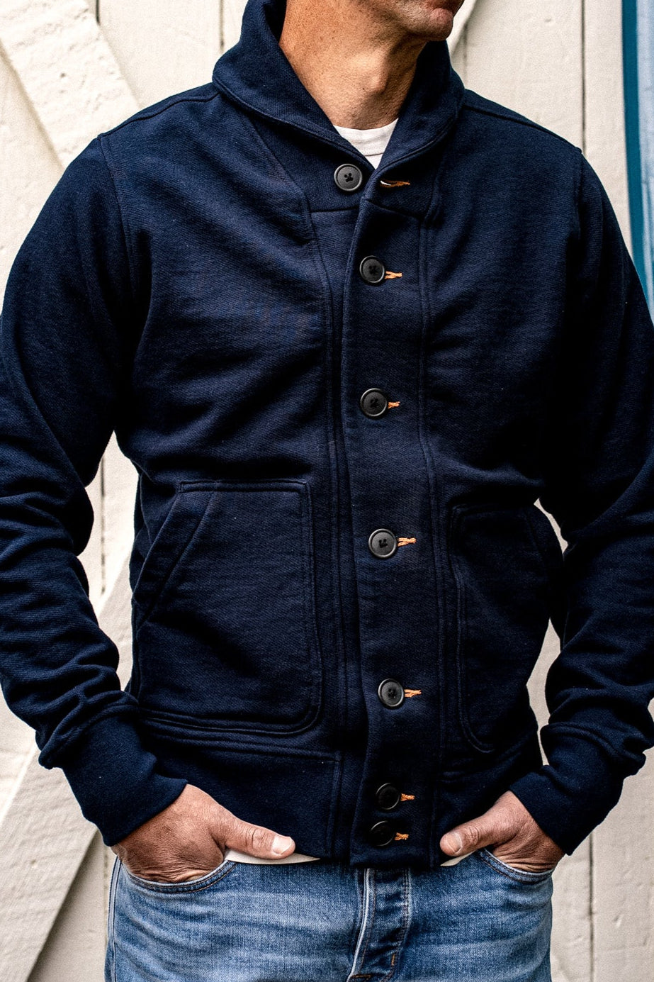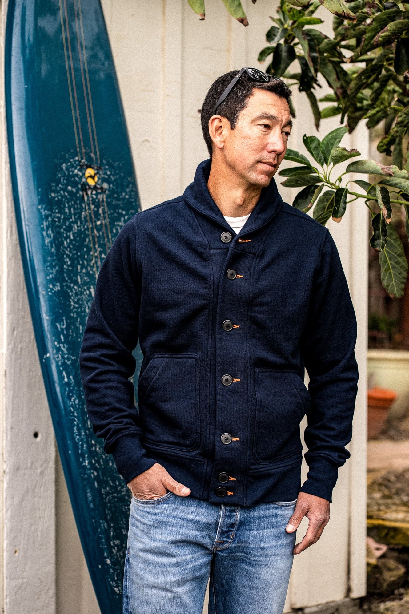 Crafted with premium natural fiber, our 14oz French Terry is no lightweight. 100% Premium combed and ringspun American cotton. Knit tight for long wearing durability and a more flattering fit. The diagonal knit adds a subtle texture on the facing. Our family run knit mill is Higgs certified and uses a recycled water process for dye to minimize water usage.The buttons for our shawl collar cardigan are made in Connecticut. Cut and sewn in our family-run shop in Los Angeles, California.