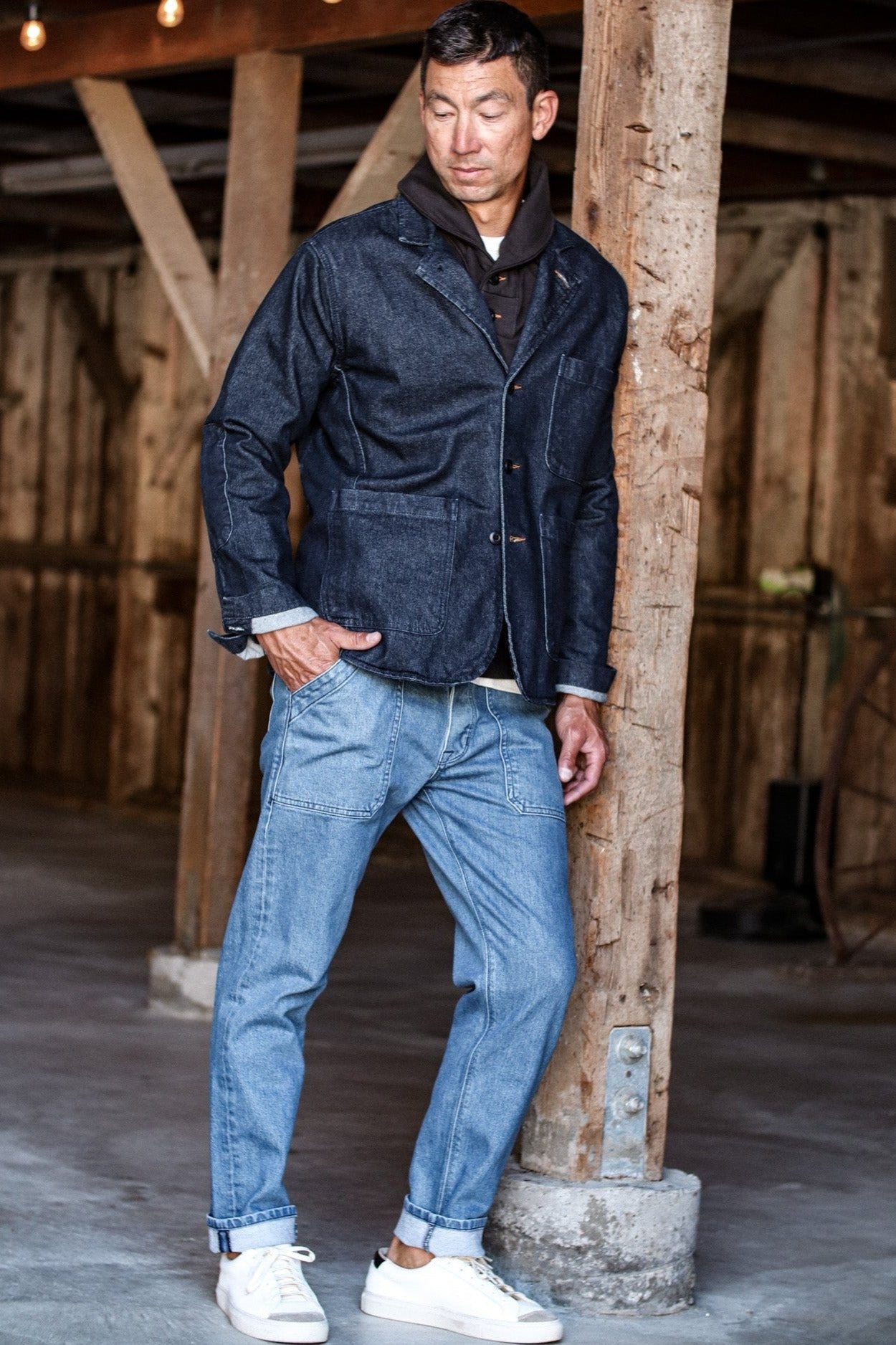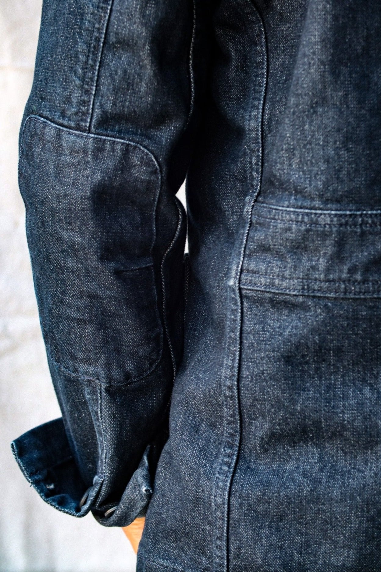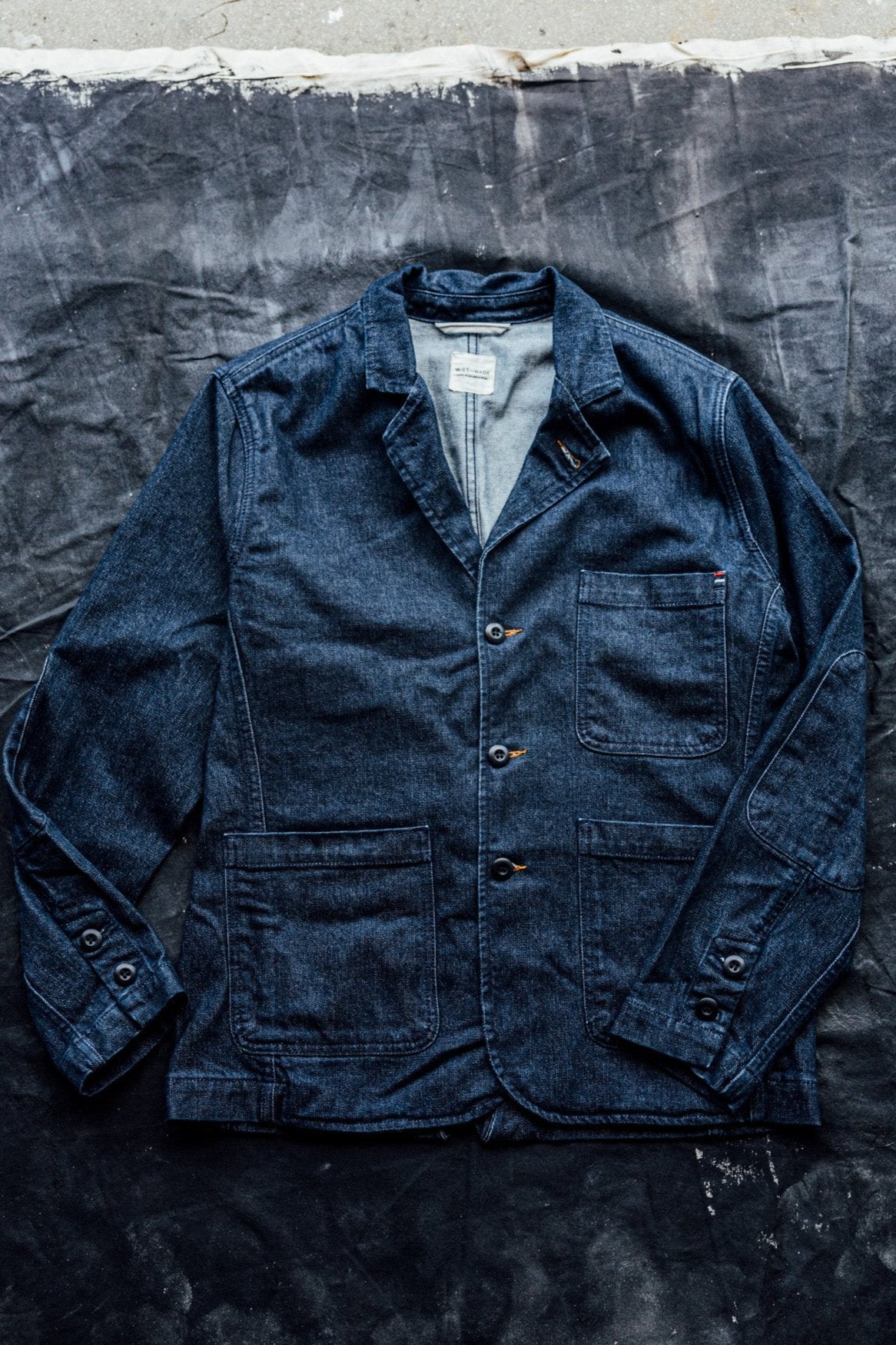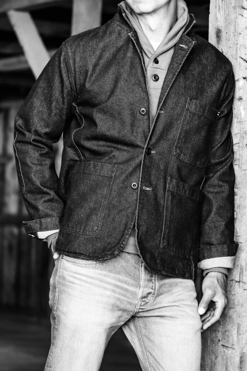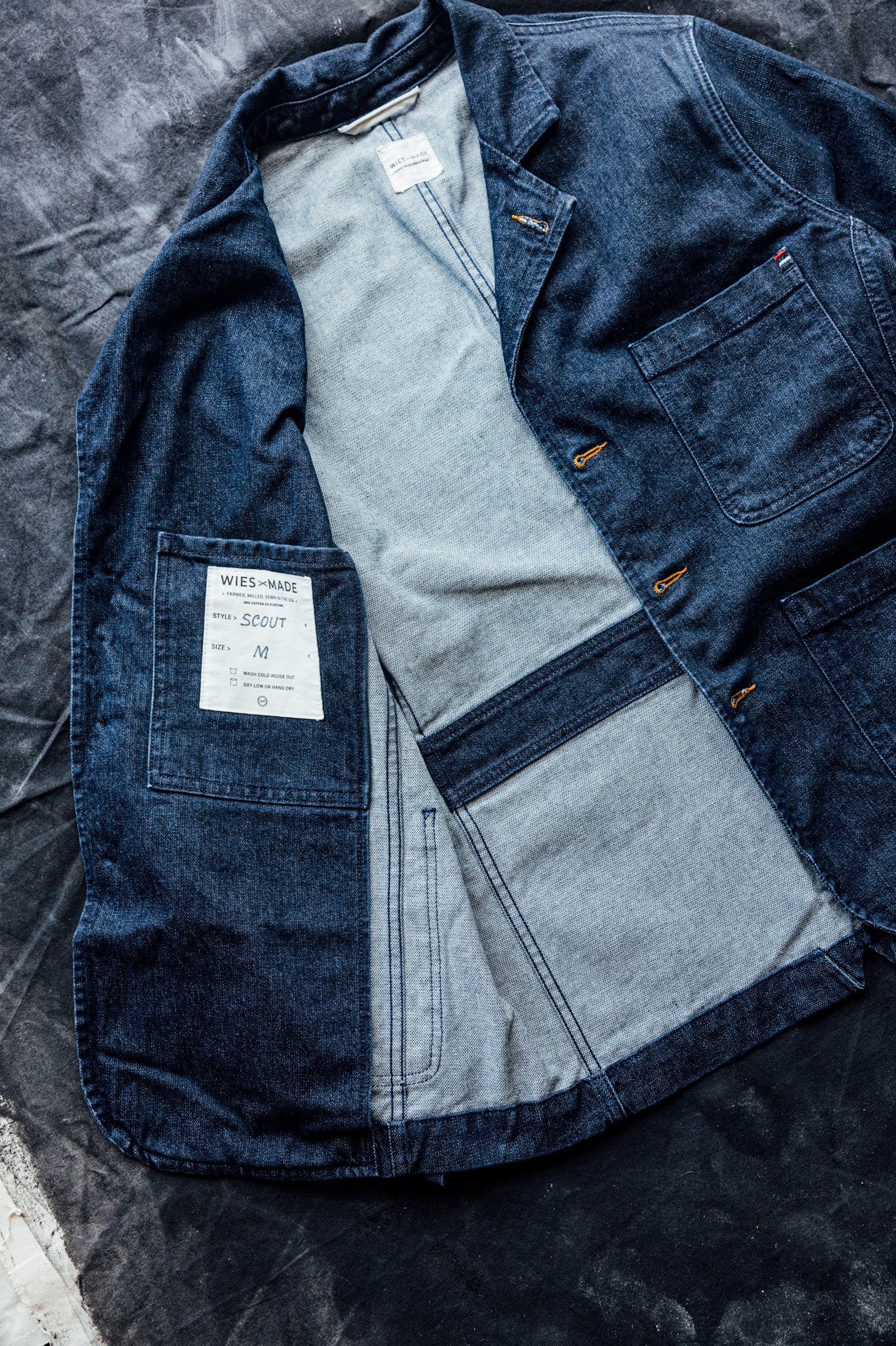 Crafted with premium natural fiber, our 13oz our stretch denim is no lightweight. Woven, dyed and finished by Mount Vernon Mills in Georgia. Premium combed and ringspun American cotton blended with 2% spandex for give and flexibility.Woven tight for long wearing durability and a more flattering fit. The buttons for our chore blazer are made in Connecticut. Cut and sewn in our family-run shop in Los Angeles, California.